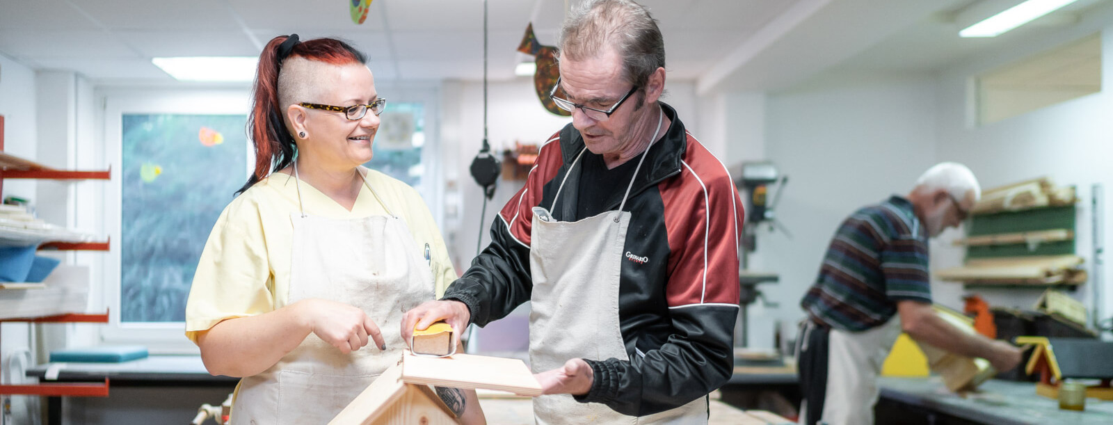 In einer  gut ausgestatteten Werkstatt wird nicht nur die Fähigkeit zum Planen und verantwortlichen Handeln trainiert. Dort angebotene Tätigkeiten wie Tischlern, Töpfern und Korbflechten bereiten auch viel Freude und motivieren zum Weitermachen.